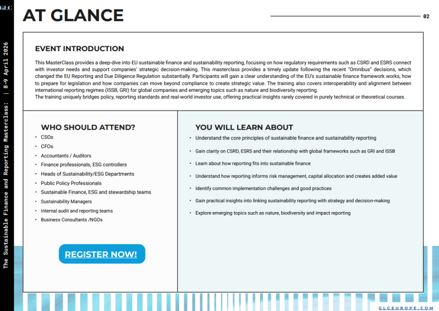 This MasterClass provides a deep-dive into EU sustainable finance and sustainability reporting, focusing on how regulatory requirements such as CSRD and ESRS connect with investor needs and support companies strategic decision-making. This masterclass provides a timely update following the recent Omnibus decisions, which changed the EU Reporting and Due Diligence Regulation substantially. Participants will gain a clear understanding of the EUs sustainable finance framework works, how to prepare for legislation and how companies can move beyond compliance to create strategic value.