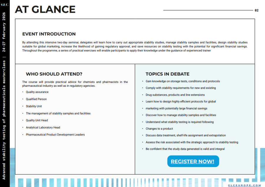 By attending this intensive two-day seminar, delegates will learn how to carry out appropriate stability studies, manage stability samples and facilities, design stability studies suitable for global marketing, increase the likelihood of gaining regulatory approval, and save resources on stability testing with the potential for significant financial savings.