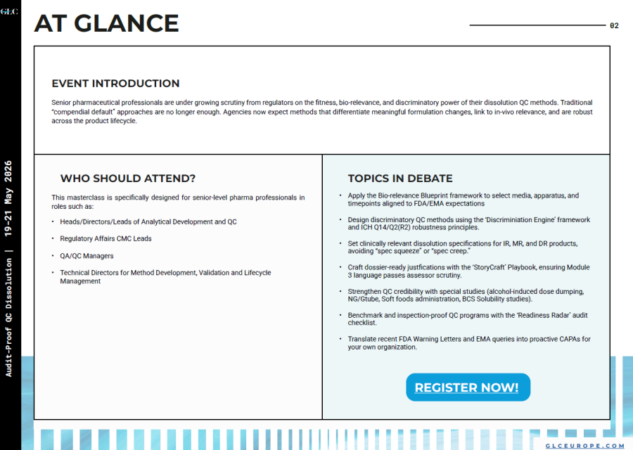 This masterclass is specifically designed for senior pharma professionals who are under growing scrutiny from regulators on the fitness, bio-relevance, and discriminatory power of their dissolution QC methods.