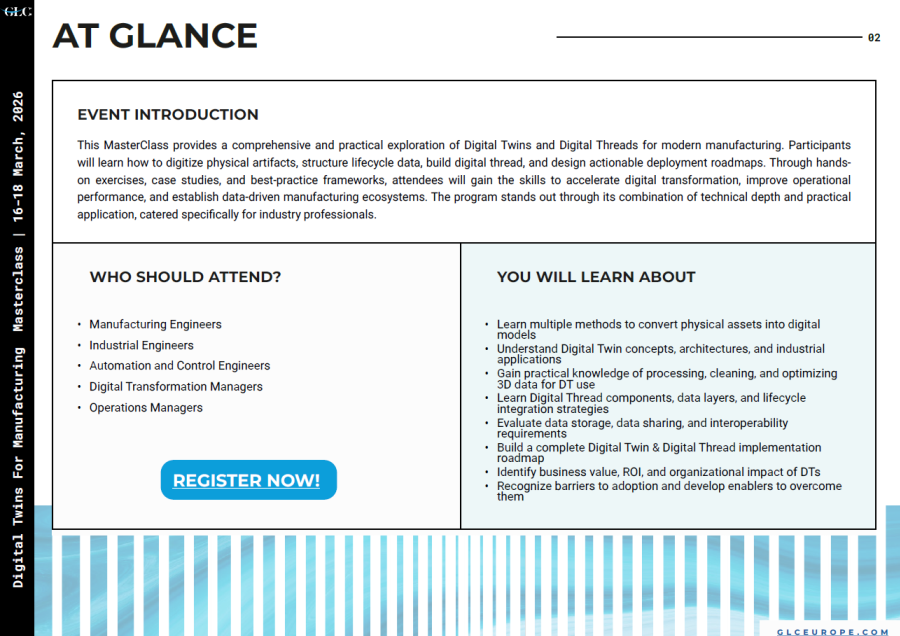 This MasterClass provides a comprehensive and practical exploration of Digital Twins and Digital Threads for modern manufacturing. Participants will learn how to digitize physical artifacts, structure lifecycle data, build digital thread, and design actionable deployment roadmaps. Through hands-on exercises, case studies, and best-practice frameworks, attendees will gain the skills to accelerate digital transformation, improve operational performance, and establish data-driven manufacturing ecosystems. The program stands out through its combination of technical depth and practical application, catered specifically for industry professionals.