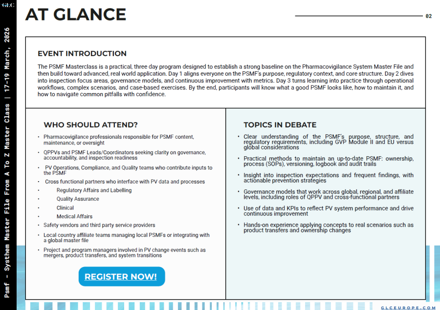 The PSMF Masterclass is a practical, three day program designed to establish a strong baseline on the Pharmacovigilance System Master File and then build toward advanced, real world application. Day 1 aligns everyone on the PSMFs purpose, regulatory context, and core structure. Day 2 dives into inspection focus areas, governance models, and continuous improvement with metrics. Day 3 turns learning into practice through operational workflows, complex scenarios, and case-based exercises. By the end, participants will know what a good PSMF looks like, how to maintain it, and how to navigate common pitfalls with confidence.