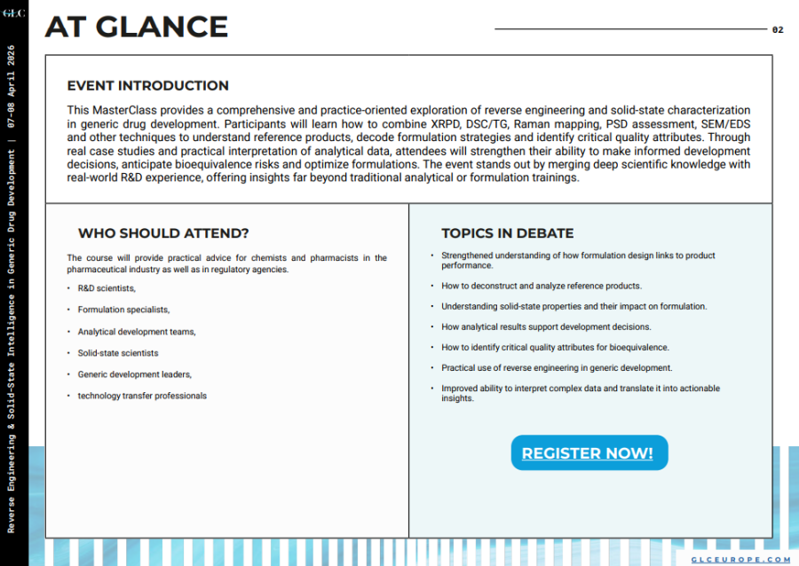 This MasterClass provides a comprehensive and practice-oriented exploration of reverse engineering and solid-state characterization in generic drug development. Participants will learn how to combine XRPD, DSC/TG, Raman mapping, PSD assessment, SEM/EDS and other techniques to understand reference products, decode formulation strategies, and identify critical quality attributes. Through real case studies and practical interpretation of analytical data, attendees will strengthen their ability to make informed development decisions, anticipate bioequivalence risks, and optimize formulations. The event stands out by merging deep scientific knowledge with real-world R&D experience, offering insights far beyond traditional analytical or formulation training.