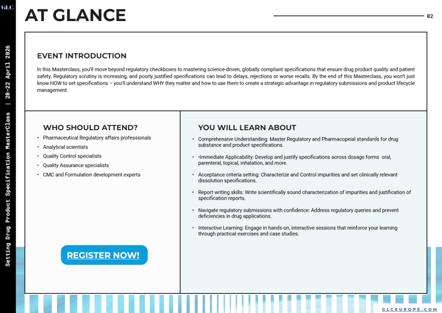 In this Masterclass, youll move beyond regulatory checkboxes to mastering science-driven, globally compliant specifications that ensure drug product quality and patient safety. Regulatory scrutiny is increasing, and poorly justified specifications can lead to delays, rejections or worse recalls.